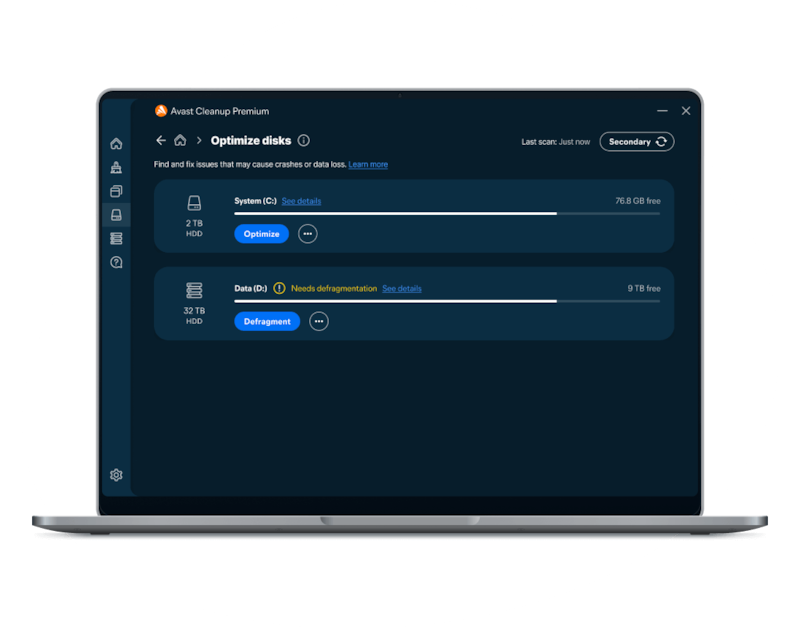시간이 지나면서 하드 드라이브 파일 및 폴더 구조가 손상되어 데이터 손실과 충돌이 발생할 수 있습니다. 디스크 최적화 도구로 오류를 방지하고 하드 드라이브 또는 솔리드 스테이트 드라이브(SSD) 문제를 해결할 수 있습니다. Avast는 다음과 같은 사항을 확인합니다.