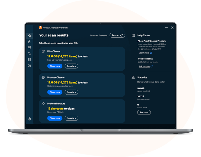 Avast Cleanup은 느리고 불안정해진 PC를 빠르게 향상하며 초보자와 전문가 모두 시스템 다운 및 작동 중지를 비롯한 까다로운 문제를 해결할 수 있도록 도구 패키지를 제공합니다.